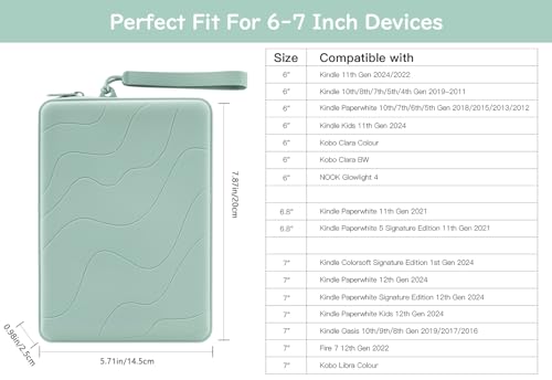 Perfect Compatibility: This versatile silicone bag measures 7.8" × 5.7" × 1" and is compatible with All-New 7" Kindle paperwhite (Signature Edition) 12th Gen 2024, 7" Kindle Colorsoft Signature Edition 1st Gen 2024, 6" Kindle 11th Gen 2024 2022, 6" Kindle 10th 8th 7th 5th 4th Gen 2019-2011, 6.8" Kindle Paperwhite (5 Signature Edition) 11th Gen 2021, 6" Kindle Paperwhite 10th 7th 6th 5th Gen 2018 2015 2013 2012, 7" Kindle Oasis 10th 9th 8th Gen 2019 2017 2016, 6" 7" Kobo Nook Tolino.