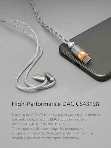 Decoding Chip: This earphone cable featuring the CS43198 DAC chip paired with a high-performance USB audio bridge chip, the M198C supports decoding up to PCM 384kHz/32bit and DSD256. The integrated USB audio bridge chip incorporates a high-performance DSP/ADC/PGA, enabling microphone recording and inline remote control functionality.