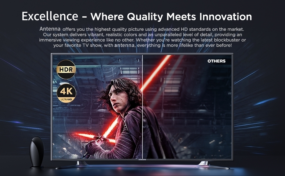 - Exceptional Signal Reception: This TV Aerial offers outstanding signal receiving capability, with a coverage range that goes beyond 650+ miles. It enables clear access to well-known channels such as BBC, ITV, Channel 4, and Channel 5. Whether you’re watching thrilling live sports events, the newest movies, or beloved TV series, it delivers impressive video quality ranging from 720p to 4K HDR. Every detail is presented in sharp, vivid colors, elevating your home entertainment experience