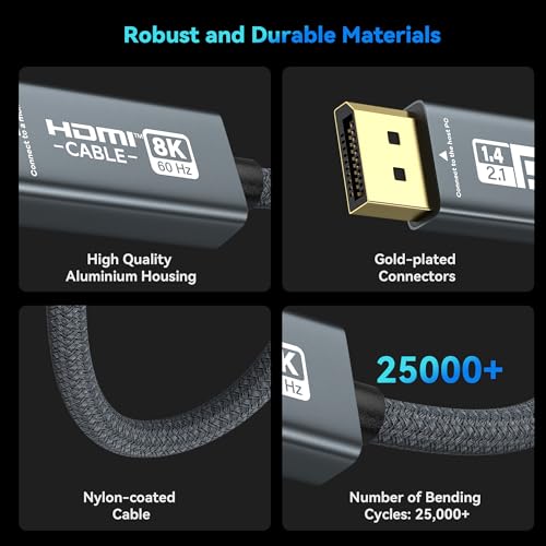 Robust and Durable Materials: The OHBUYAGN Display Port to HDMI cable features a braided cable jacket that prevents wear and tear. Equipped with a strain relief mechanism, it can withstand 25,000 plug cycles and bends, ensuring a long service life even with frequent use.