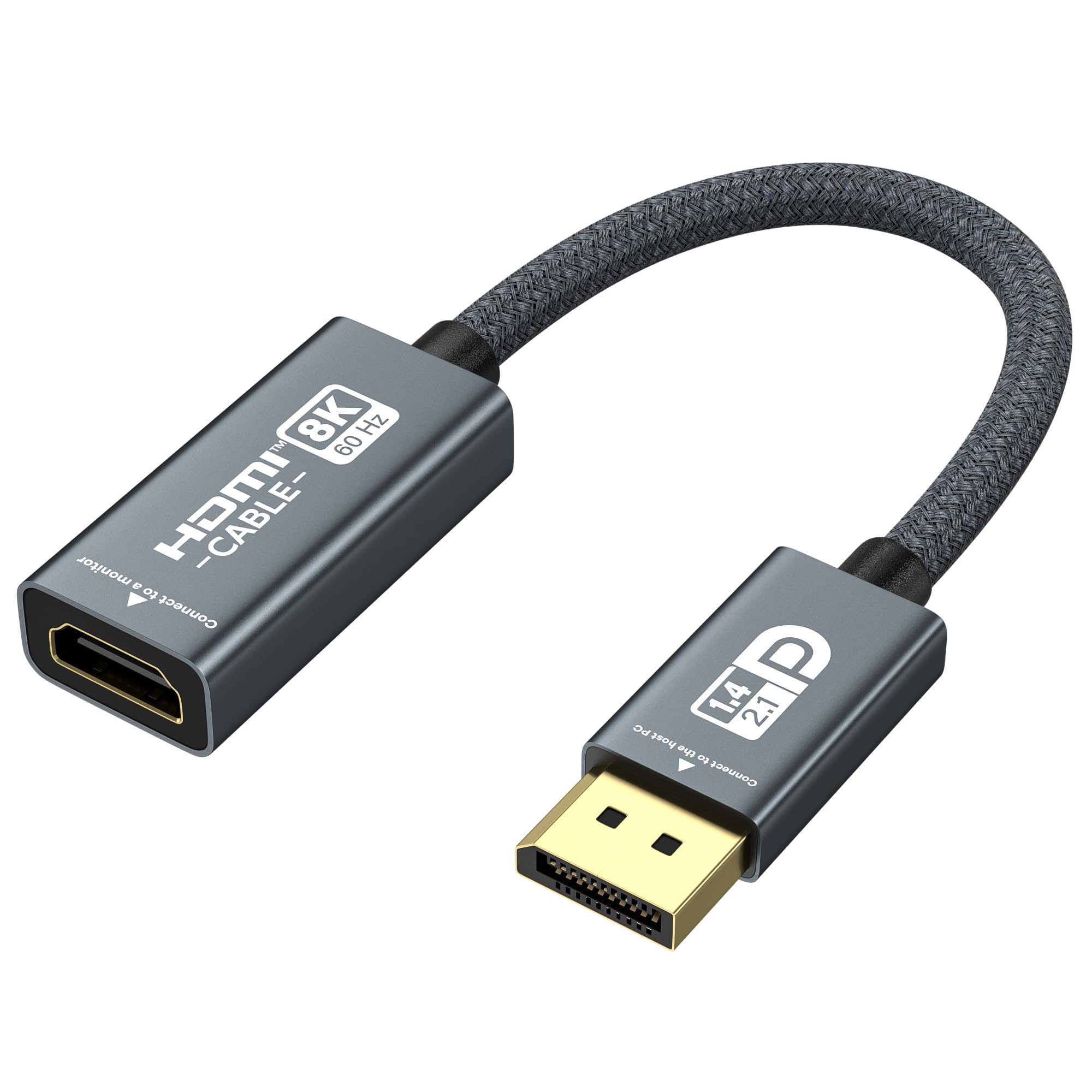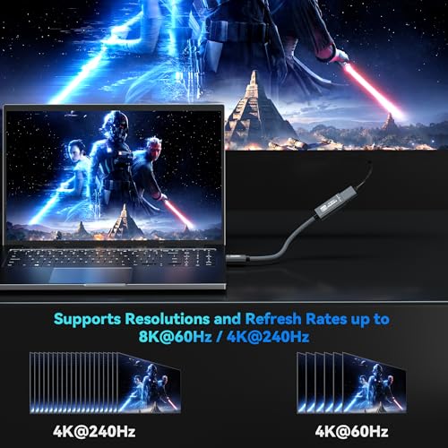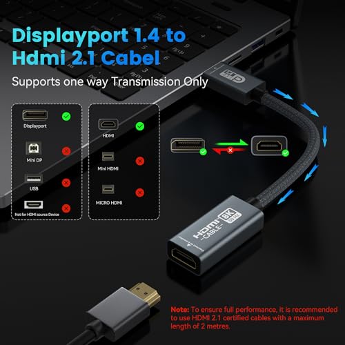 8K60Hz / 4K240Hz High Definition Resolution: Our DisplayPort to HDMI cable transmits high definition images, making it ideal for gaming, watching videos and working on premium displays and televisions equipped with HDMI inputs. It supports resolutions and refresh rates of 8K60Hz and 4K240Hz. Note: To ensure full performance integrity, it is recommended to use an HDMI 2.1 certified cable with a maximum length of 2 metres for the downstream connection.