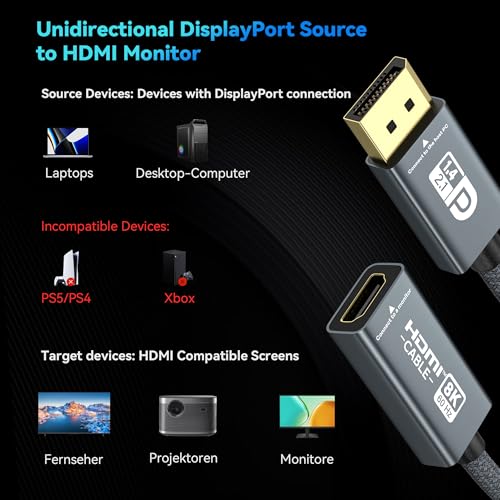 DisplayPort to HDMI: The DisplayPort to HDMI 8K adapter supports the latest DP 1.4, DP 2.1, and HDMI 2.1. It connects computers, nVidia graphics cards with DisplayPort interfaces (as RTX 4090/4080/4070, RTX 5090/5080/5070) to an HDMI HDTV or monitor. Supports G-SYNC VRR, HDR, Dolby Vision, HDCP 2.2/2.3 and DSC. *Does not support FreeSync.* Note: This cable only supports from DP to HDMI conversion and does not bidirectional. It is not for PS5/PS4/Xbox/switch2 or other HDMI host devices.