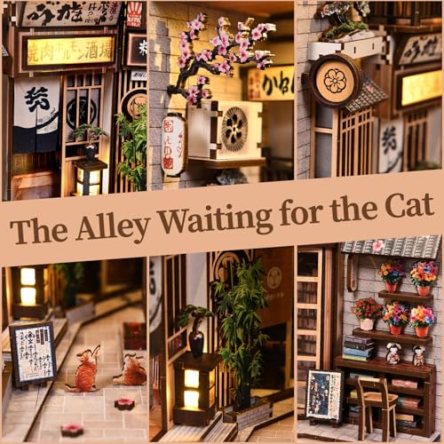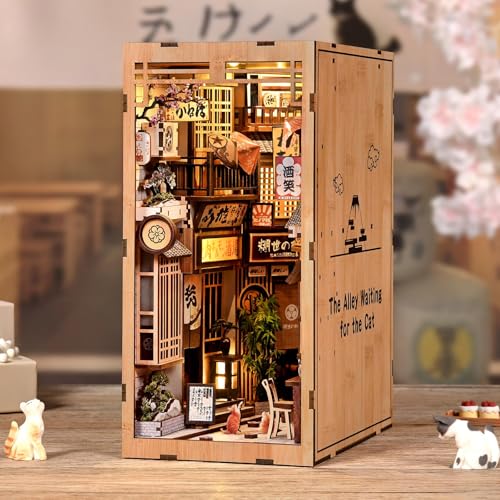 DIY Wooden Japanese Book Nook Shelf Insert Kits Miniature Model Kit The Alley Waiting for The Cat Bookend 3D Puzzle Birthday Gifts Color5