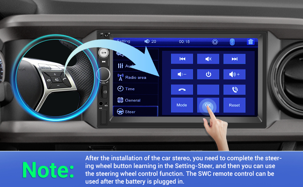 【Backup Camera & SWC】①Reversing Assistance: You can connect the 12 LED rear view camera, and it will provide you with assistance in reversing. ②Steering Wheel Controls: After you complete the steering wheel button learning in the Steer, you can make calls, adjust the volume or change songs more safely