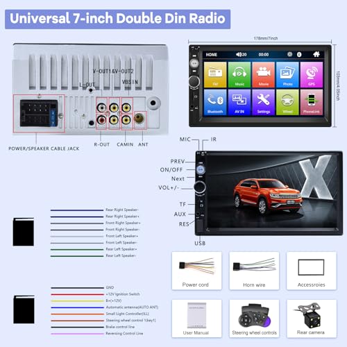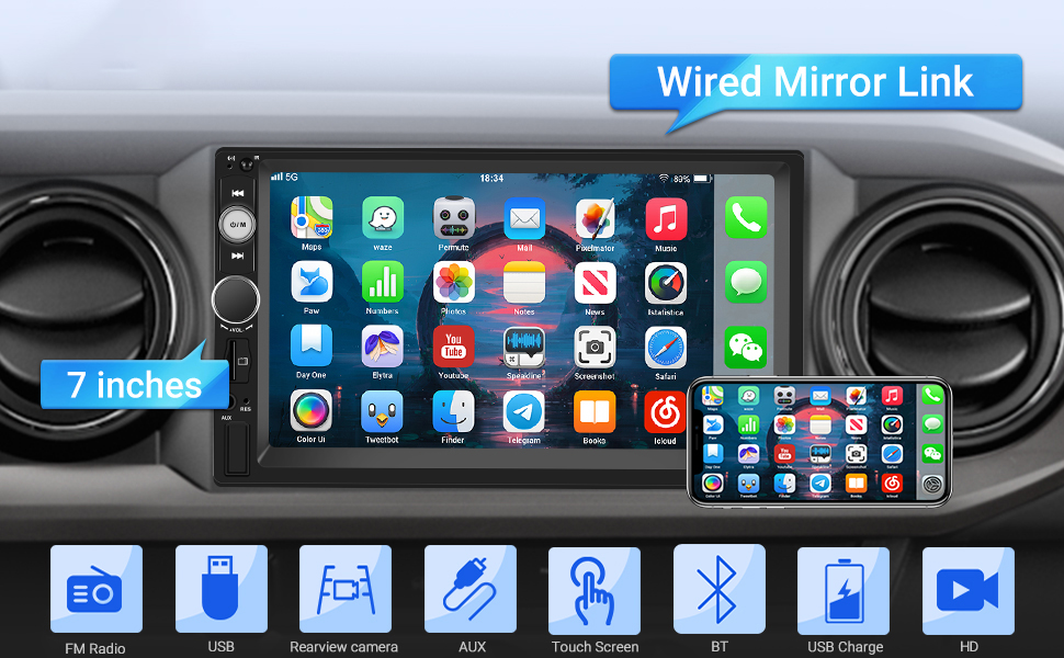 【Wired Mirror Link】The double din car radio is convenient for you to integrate your smart phone via wired mirror link. The 7 inch car stereo compatible with almost all of Android and IOS phones, to sync your smartphone to the double din car stereo screen and enjoy such as maps, movies and more