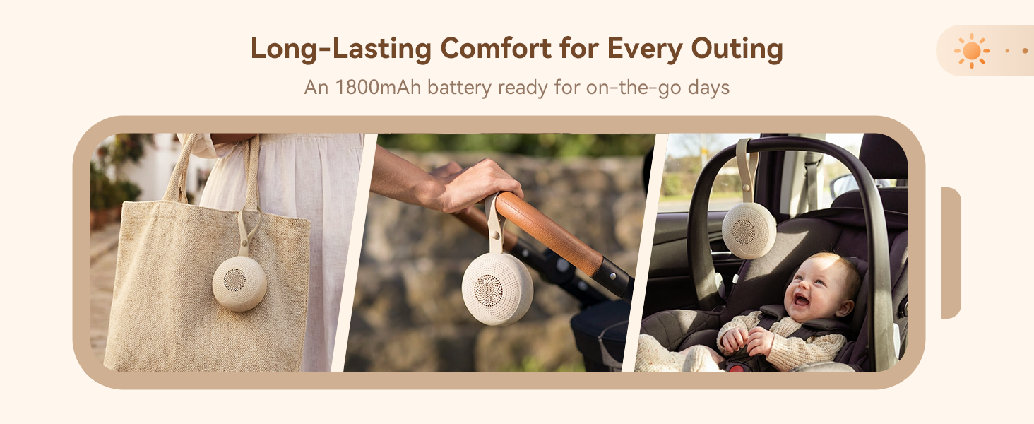- : Built for use beyond the home, this lightweight portable white noise machine fits easily into daily routines. It straps easily to prams, cots, nappy bags or car seat for soothing on the go. Rounded buttons are designed to stay secure through daily use. With an upgraded 1800mAh battery—far above most sound machine baby options—it delivers long-lasting comfort outdoors, making it a dependable white noise machine for everyday outings.