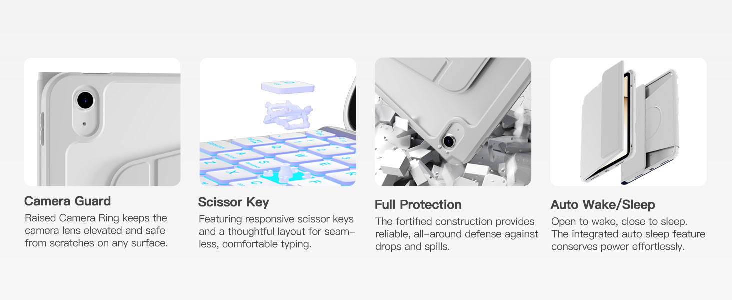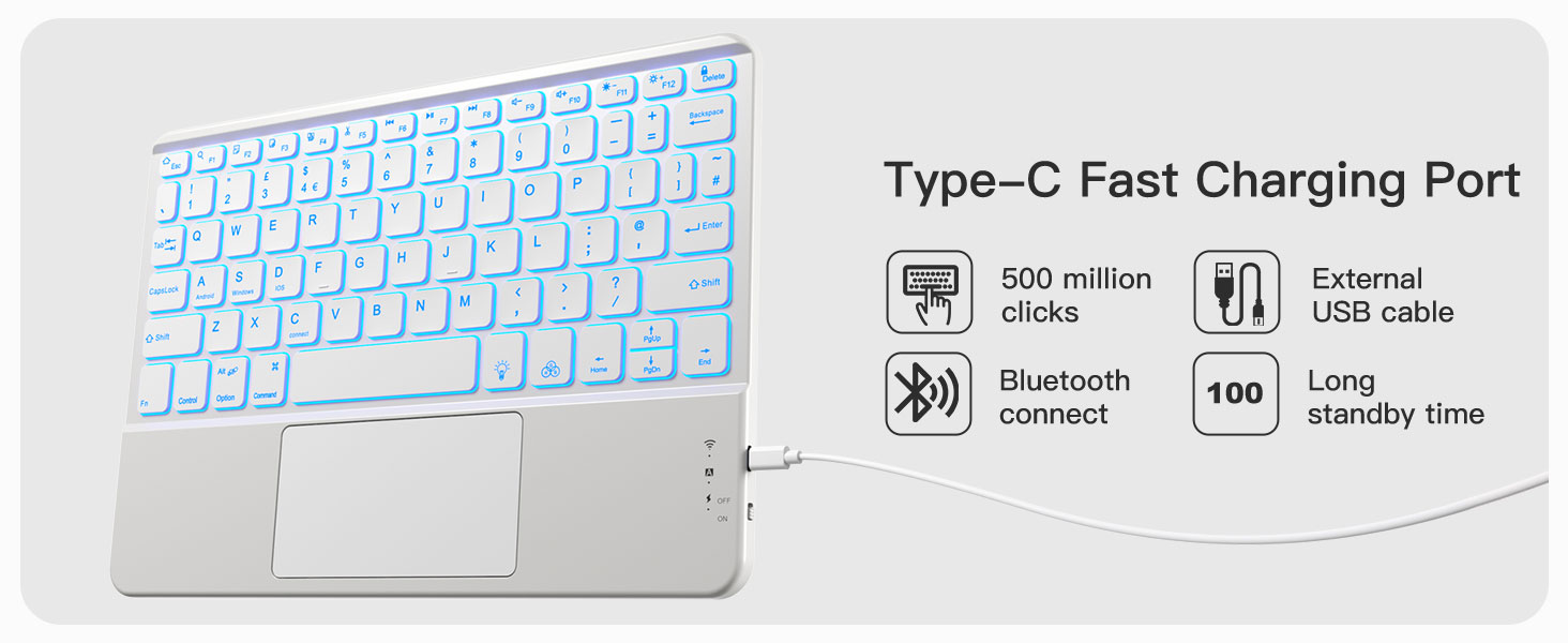 【Secure Magnetic Attachment & Long-Lasting Battery】Enjoy a firm magnetic connection for your iPad that clicks into place effortlessly and detaches in a second. The bluetooth keyboard pairs automatically via stable Bluetooth and reconnects instantly. Powered by a 420mAh battery with Type-C fast charging (full charge in 2-3 hours), it intelligently enters sleep mode after 15 minutes of inactivity to conserve power for extended standby.