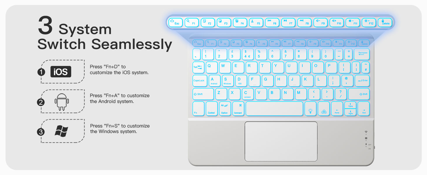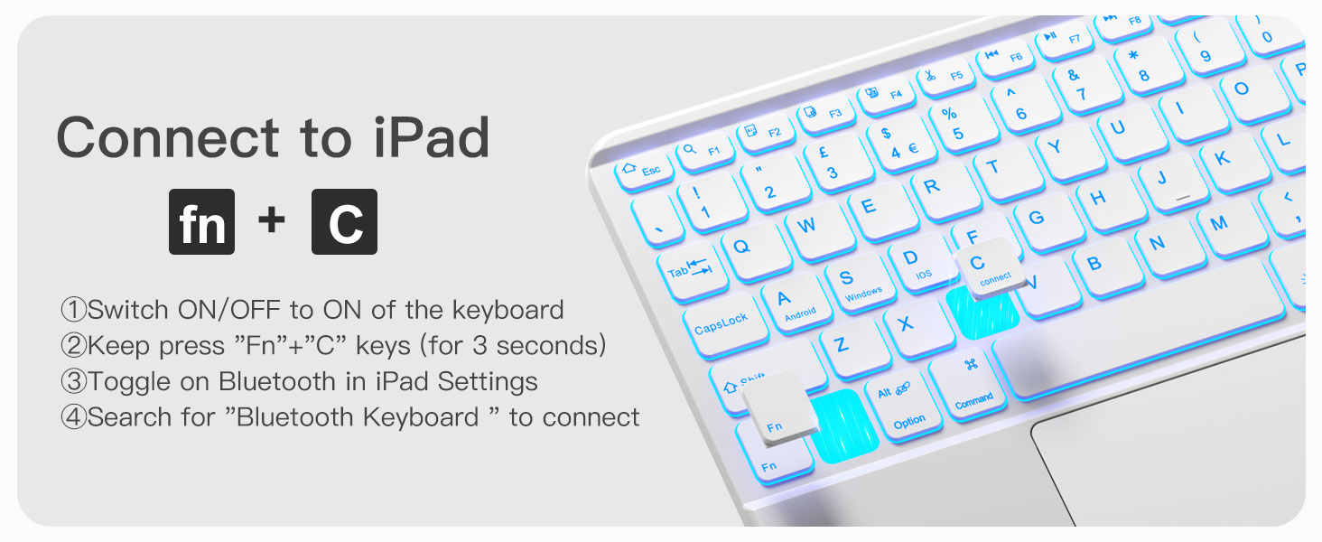 【Pair Keyboard with iPad】Power on the iPad keyborad and open Bluetooth in your ipad's Settings. Press and hold the "Fn + C" function keys for 3 seconds. Search for "Bluetooth Keyboard" under Other Devices and tap Connect. The Bluetooth indicator will turn off once successfully paired. (Note: After initial pairing, the keyboard will reconnect automatically whenever the keyboard is turned on.)