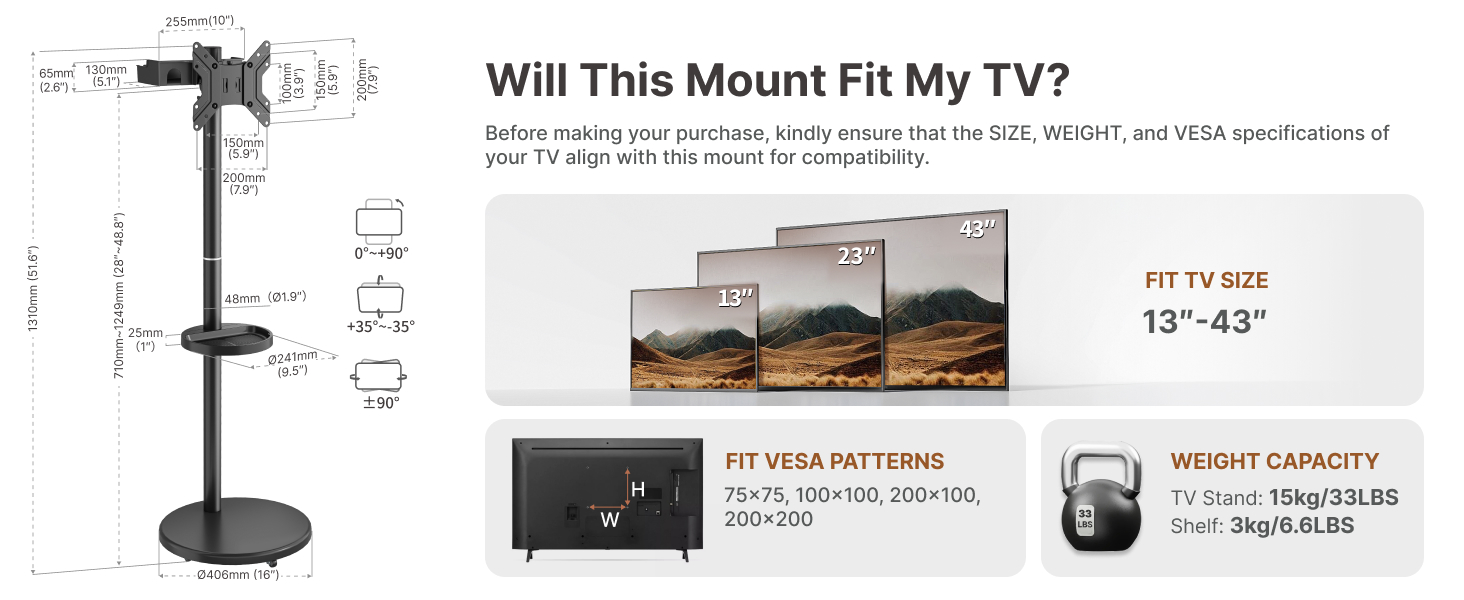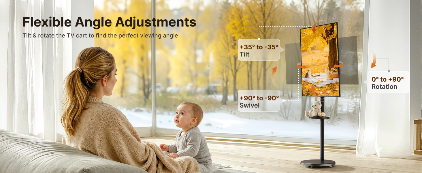 Flexible TV Angle Adjustment: Enjoy complete flexibility with the ability to adjust the TV angle. The stand supports a tilt range of -35° to +35°, a swivel range of -90° to +90°, and a rotation capability from 0° to 90°, making it easy to find the perfect viewing angle in any setting.