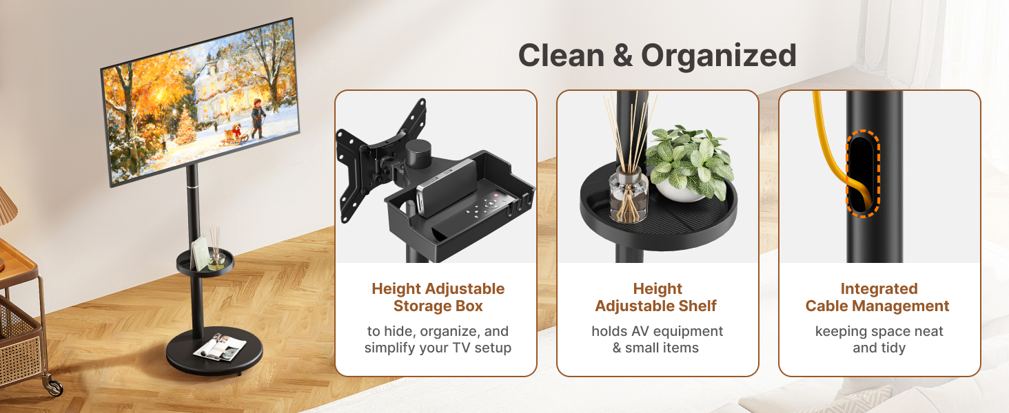 Powerful Storage and Cable Management: Maximize your space with versatile storage options. Featuring an adjustable bracket, a built-in cable management system, and an adjustable storage box for extra storage, this TV stand helps keep your entertainment area tidy and clutter-free.