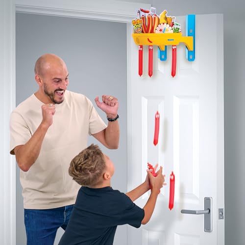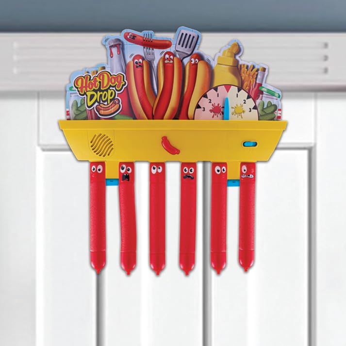 - Hot Dog Drop features handy brackets and adjustable height so the unit can be hung from the back of a door for an easy place to play.