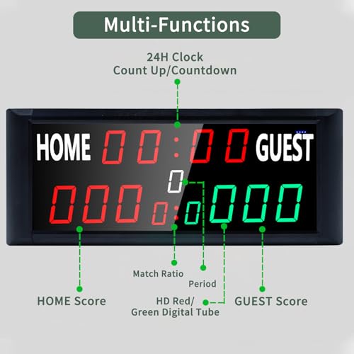 - LED Scoreboard with Tripod – Features: Countdown + Count-Up + Live Clock + Game Scores + Round Scores. Includes tripod – Perfect for basketball, football, table tennis, hockey, baseball, corn hole, and tabletop games. Supports 3+ digit scores for high-scoring matches.