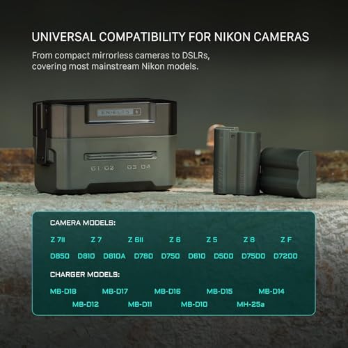 - UNIVERSAL DESIGN Compatible with any Camera or Accessory that Supports EN-EL15C Batteries,Compatible with Nikon Z8, Zf, Z7II, Z6II, Z7, Z6, Z5, D850, D810, D810A, D780, D750, D610, D500, D7500, D7200. Also works with charger models: MB-D18, MB-D17, MB-D16, MB-D15, MB-D14, MB-D12, MB-D11, MB-D10, and MH-25a.