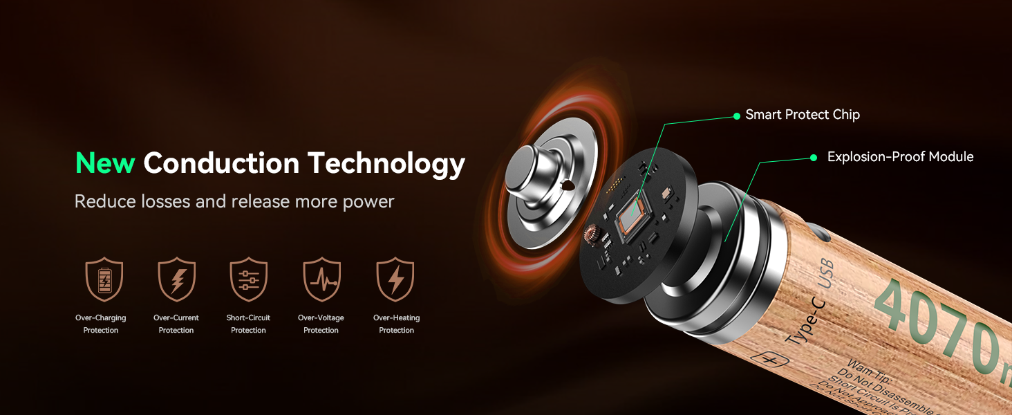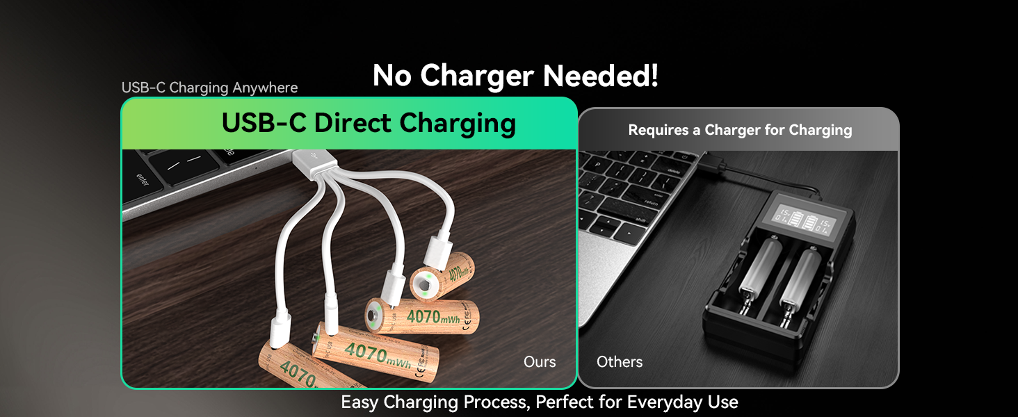 No extra charger. Built-in USB-C port & smart chip per battery, rechargeable via 5V USB (laptop, car, power bank). AAA: ~1h; AA: ~4h full charge. 1-to-4 fast charge (up to 4 batteries), 60-200% faster than traditional Ni-MH batteries (2.5-5h).