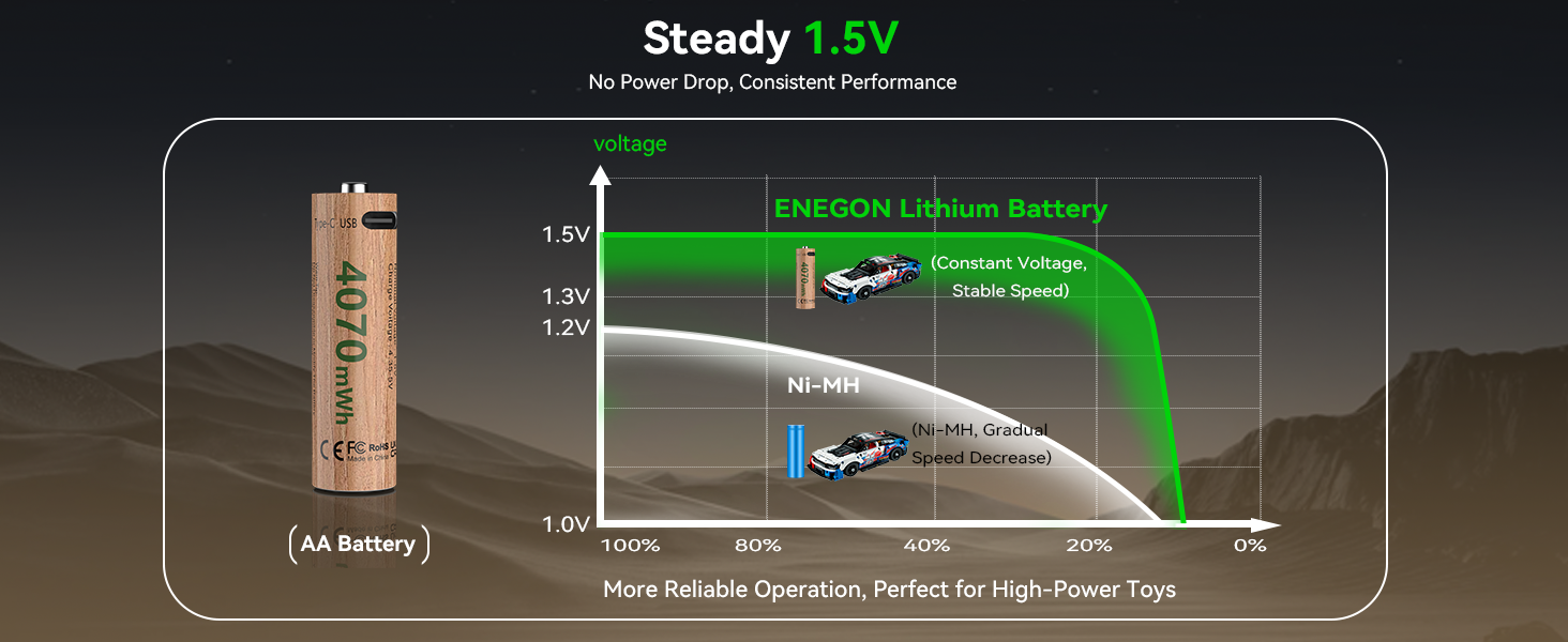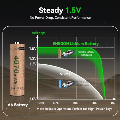 - ✔️【Powerful Performance】ENEGON batteries deliver an impressive 4070mWh for AA and 1100mWh for AAA models. Featuring , consistent&stable 1.5V power output throughout the entire usage cycle. Even under high-load conditions or low battery levels, the voltage remains reliably stable. Your devices will continue to operate normally until the remaining battery capacity drops to just 15% – at which point the voltage will gradually decrease and a low-battery alert will trigger.This effectively prevents device power degradation, slow response, or unstable operation, ensuring optimal and stable performance for all voltage-sensitive devices.