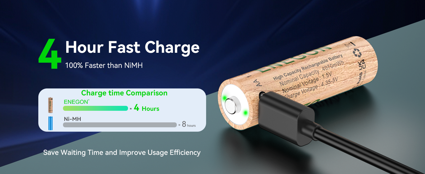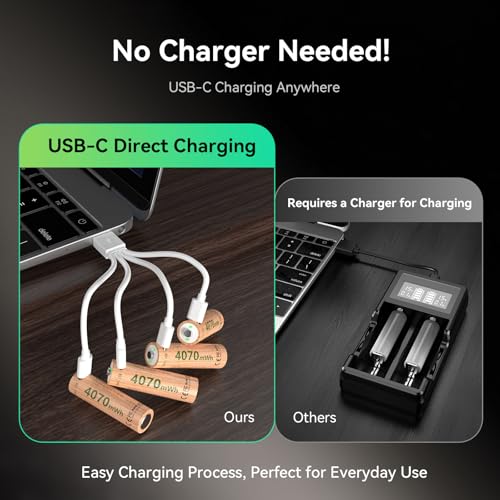 - ✔️【No Dedicated Charger Needed】Comes with A USB-C charging cable (1-to-4 design) is included in the package. AAA batteries fully charge in approximately 1 hour, while AA batteries take around 4 hours. You can charge up to 4 batteries simultaneously – no separate charger or tedious waiting is required. Recharge quickly via your laptop, car USB port, or power bank for on-the-go top-ups, effortlessly achieving efficient charging anytime, anywhere. Whether you’re traveling, camping, or using the batteries for daily purposes, you can enjoy a fast, safe, and hassle-free charging experience.