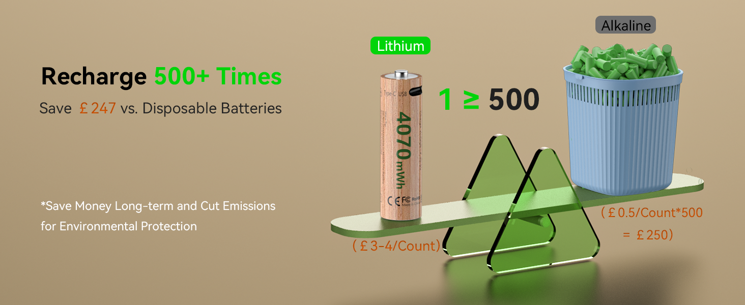AA/AAA batteries: ≥500 cycles, each replaces ~500 disposables. £247 saved per battery.Long-term use cuts costs, reduces waste & heavy metal pollution, eco-friendly, more economical & sustainable than disposable alkaline batteries.