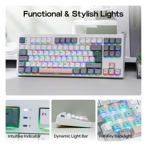 - Professional Gaming Keyboard with RGB Light: Unlock a new level of competitive performance, as the TH87 gaming keyboard ensures you are always one step ahead. In both wired and 2.4GHz wireless modes, you get a blazing-fast 1000Hz polling rate and lightning-quick response times of just 2ms (Wired) and 5ms (2.4GHz). Fast and reliable with anti-ghosting, the EPOMAKER TH87 also comes with the tactical asset of per-key RGB backlights, fully adjustable in saturation, brightness and speed. Get critical keys in a contrasting color to improve reaction time or simply use the dynamic effect to create a personalized, immersive atmosphere that pulses with the vibe of your gaming movement