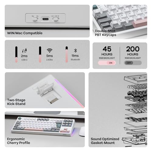 - Tri-Mode Wireless with 10000mAh Battery: Enjoy the massive 10000mAh battery of the TH87 wireless gaming keyboard. Get up to 45 hours of continuous use with the backlight set to its brightest for those intense all-night gaming sessions, or an incredible 200 hours with the backlight off. Connectivity is seamless across any device; simply switch from writing an email on your phone, to focused coding on your Mac Lapto, to playing a mobile game on your Android tablet with the flick of a switch and shortcuts. Ultra-fast 2.4GHz wireless, convenient Bluetooth or reliable wired cable, the TH87 keyboard provides unmatched battery life in tri-mode connectivity to power your gaming and productivity