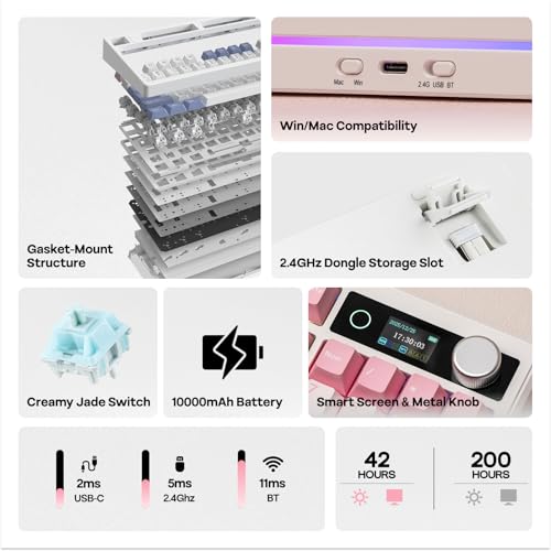 Gaming Keyboard with 10000mah Battery: Image a workspace where one keyboard rules every screen without the clutter of wires? The TH99 PRO combines reliability and limitless mobility. Equipped with a massive 10,000mAh battery, this tri-mode gaming keyboard offers 150-200 hours of high-performance use on a single charge (RGB OFF). Or, leave the RGB lighting on full blast with 40 plus hours of intense uses including screen display. The versatile connectivity allows seamless switch from a high-stakes competitive match on your PC to responding to a text on your Android phone, and then jump straight into a creative project on your Mac laptop with just a quick shortcut