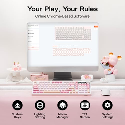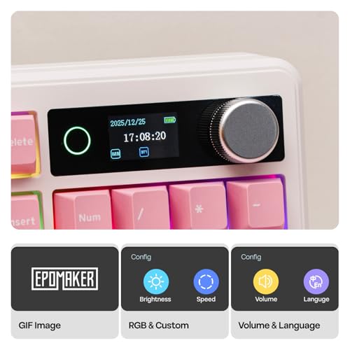 PRO with Screen, Functional Design: Experience the EPOMAKER TH99 PRO custom keyboard, the fully programmable extension of your workflow and playstyle. The precision-engineered volume knob provides instant auditory control, allowing mid-game toggle without ever alt-tabbing; while the stunning glass screen, with Infor page for keyboard status, battery and time monitor, serves as your digital command center with GIF display and RGB control panel. The Chrome-based software, available online and offline, empowers you to emap every key and record complex macros to automate repetitive Excel strings or multi-hit game combo with a single tap