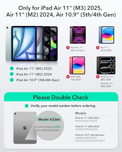 - Compatibility: only for iPad Air 11" (M3/M2) 2025/2024, iPad Air 10.9" (5th/4th Gen) 2022/2020; Models: A3266, A3267, A3270, A2902, A2903, A2904, A2588, A2589, A2591, A2316, A2324, A2325, A2072