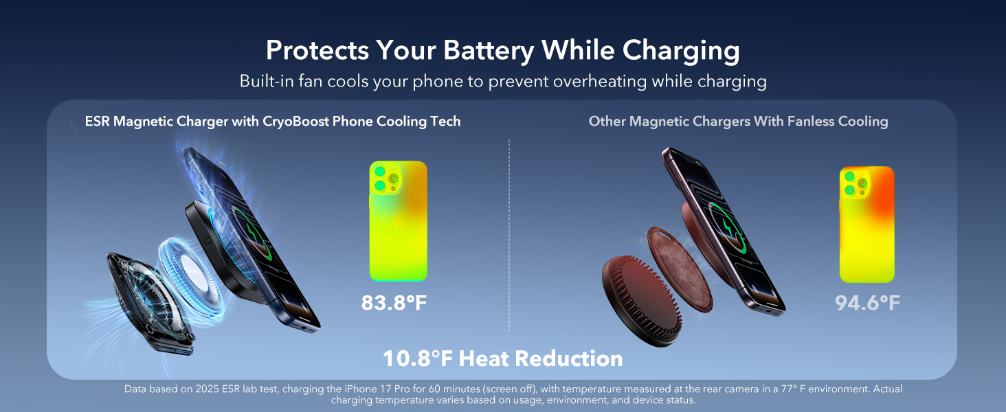 Qi2.2 Certified Fast Charging: official Qi2.2 certified 25W wireless MagSafe compatible charger equipped with CryoBoost phone cooling technology to ensure safer, more reliable charging at ultra-fast speeds
