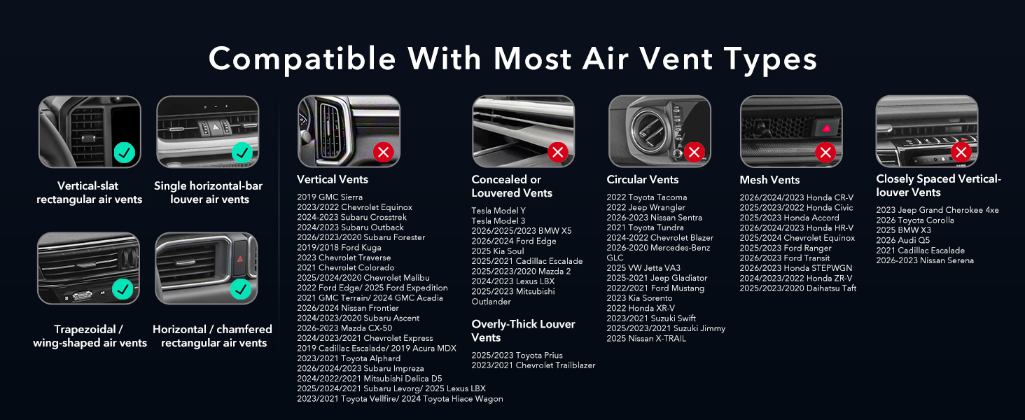 Wide Compatibility: fits most vents with an extendable 32 mm hook; it's compatible with iPhone 17/16/15/14/13/12 series (excluding SE, mini series and 16e), Samsung S25 series (with ≤2 mm magnetic cases), and Google Pixel 10 (except Pixel 10 Pro Fold). ⚠️Please note the actual charging speed varies by device