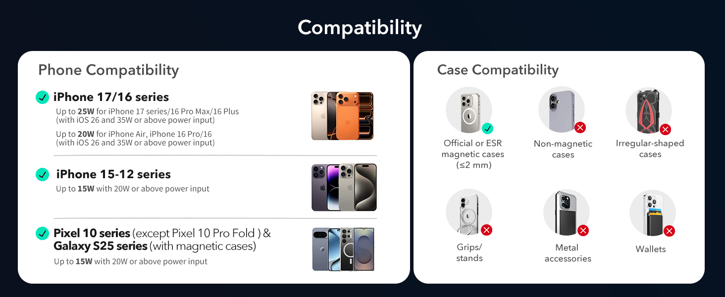 ⚠️Important Reminder: recommended for use with official MagSafe case or ESR magnetic cases; not compatible with Motorola, OnePlus, and Google phones (except Google Pixel 10 / Google Pixel 10 Pro / Google Pixel 10 Pro XL)