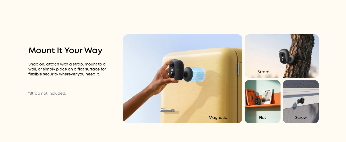 Effortless Security, Anywhere: Easily mount with magnets, rope/string, screws, or simply place on any flat surface to effortlessly install your security camera outdoors or inside. Note: To ensure full functionality, ensure your eufy App is updated to version 5.2.10_16477001 (iOS) or 5.2.10_17014 (Android) or newer.