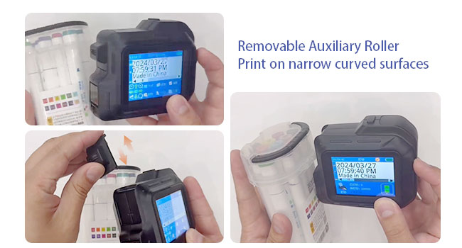 - Removable Guide Wheel for Complex Surfaces. The detachable guide wheel enables precise printing on narrow gaps, curved bottles, uneven metal/plastic surfaces, and steel pipes. Achieve 600 DPI high-resolution text, barcodes, QR codes, dates, and logos on wood, glass, leather, and ceramics.