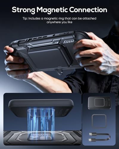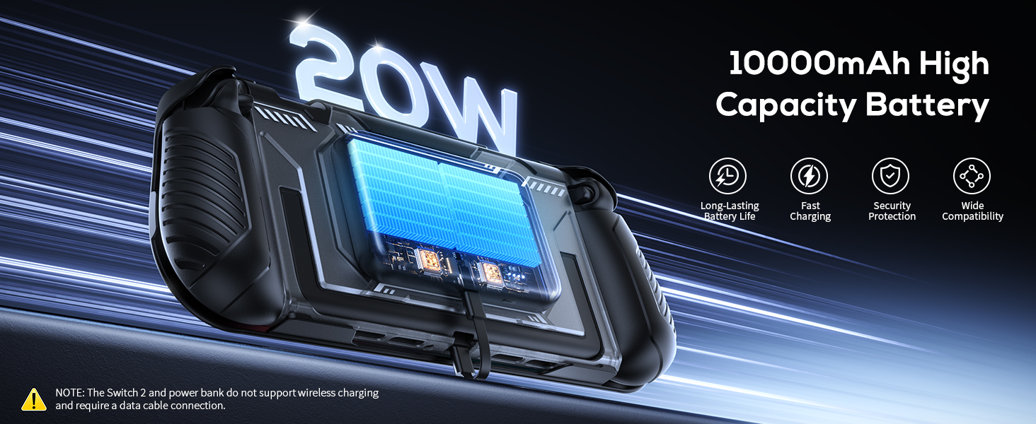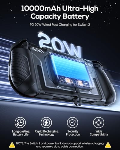 - 【10,000mAh High Capacity Battery】Specifically designed for travel and marathon gaming. This Switch 2 case comes with a 10,000mAh power bank that supports up to PD 20W output, boosting Switch 2 charging speed by 1.5x and keeping you in the game longer. The power bank and case back feature a magnetic ring, securely attaching the power bank to the case so you can game anytime, anywhere. NOTE: The Switch 2 and power bank do not support wireless charging and require a data cable connection.