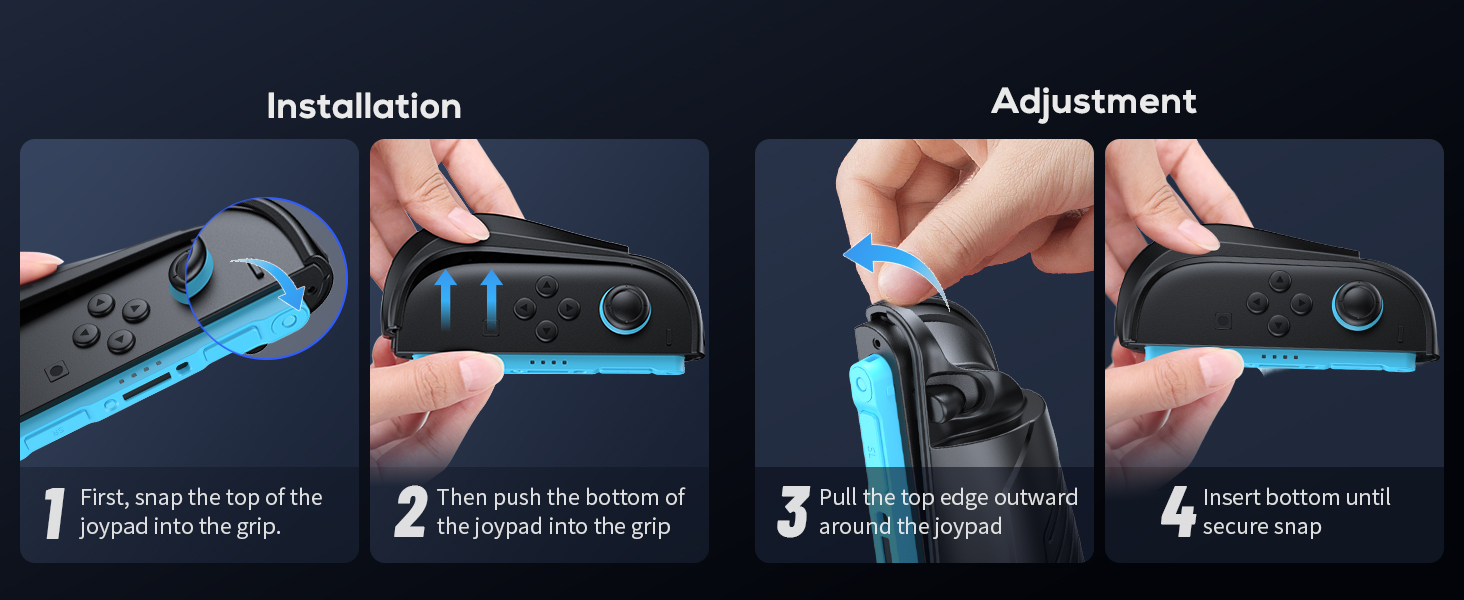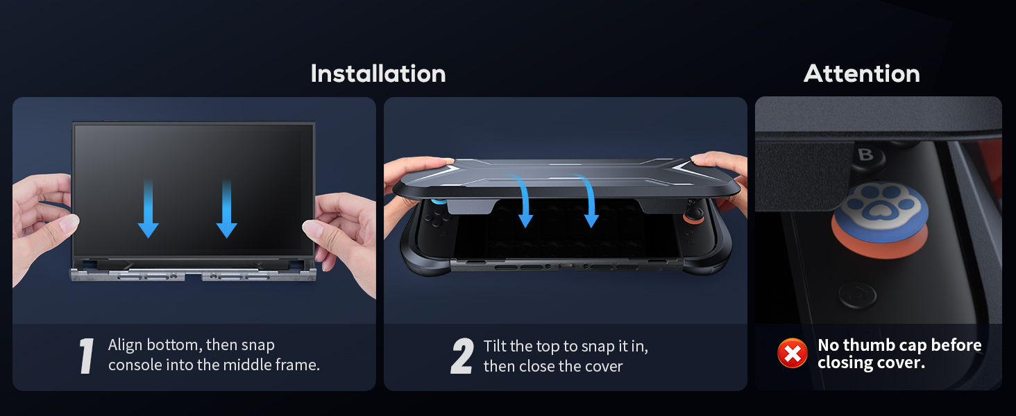 - NOTE: ①The power bank and Switch 2 console do not support wireless charging and require a data cable connection. ②To better protect your console, ensure the Joypad are fully inserted into the grip, with the soft edge at the top of the grip completely covering the edges of the joypad. ③When removing the middle frame, start from the top. ④When closing the top cover, do not use the thumb grip on the Joypad. ❗Tip: For specific installation details, refer to the installation diagram on the left and the installation video.