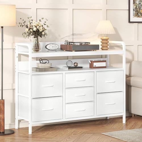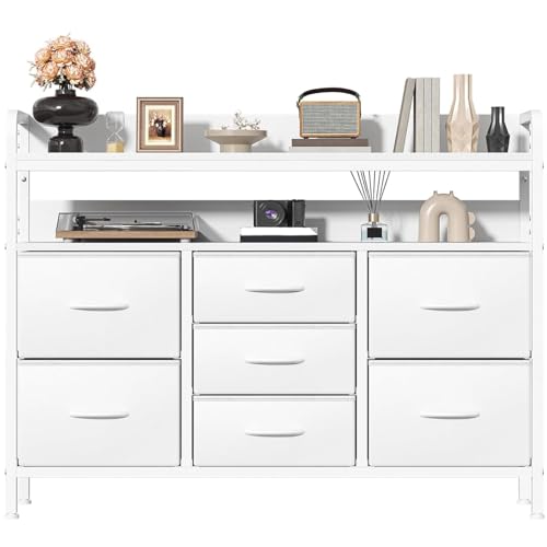 Feonase Chest of Drawers Bedroom, Fabric Dresser with 7 Drawers, Storage Dresser with 2 Layer Shelves, Tall Storage Organizer Unit with Steel Frame, for Bedroom, Living Room, Hallway, White