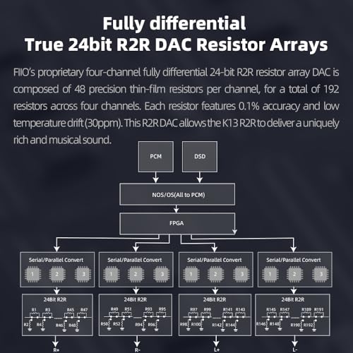 - Fully differential true 24Bit R2R resistor arrays DAC – FIIO’s proprietary four-channel fully differential 24-bit R2R resistor array DAC is composed of 48 precision thin-film resistors per channel, for a total of 192 resistors across four channels. Each resistor features 0.1% accuracy and low temperature drift (30ppm). This R2R DAC allows the K13 R2R to deliver a uniquely rich and musical sound.