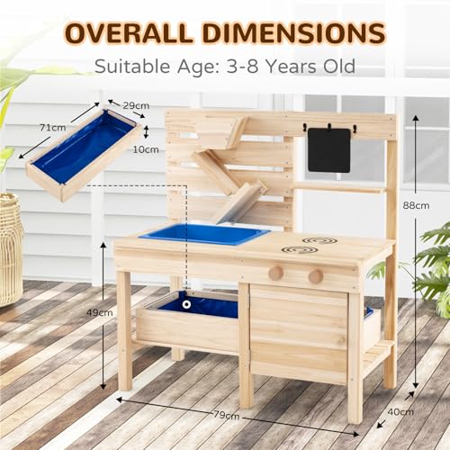 Fir Wood Kids Mud Kitchen, Outdoor Children Play Kitchen with Detachable Sandbox, Sink, Chalkboard, Sand Funnel, Garden Toddler Pretend Kitchen Toy Set Potting Bench for 3-8 Years Old