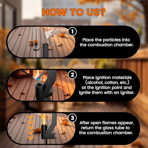 2.2LBS Fuel Capacity & 1-Hour Warmth: Holds 2.2 lbs of wood pellets, providing continuous warmth for up to 1 hours. Note: When there is fire burning inside the glass tube, please take the small nut off at the top tip of chimney cap to prevent melting