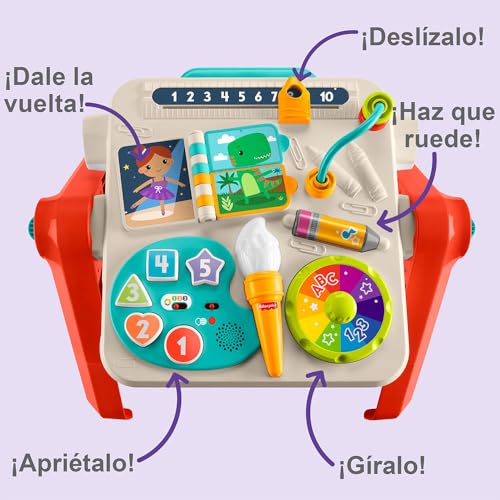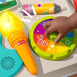 Press the paint buttons or rotate the color wheel to activate lights, music and sounds. Plus, it has fun activities such as a beaded bar, a rolling pen, a number slider, and a book with pages to turn around.
