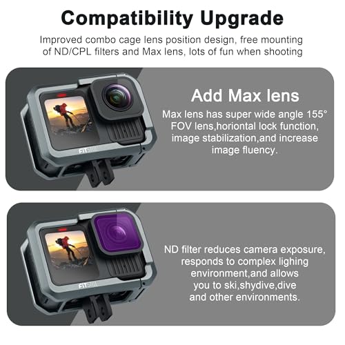 - 【For GoPro Hero 13/12/11/10/9 Black】Only for GoPro Hero 13/12/11/10/9 Black, you can directly install the MAX lens and ND CPL filter without removing the protective frame, which would interfere with normal camera use.