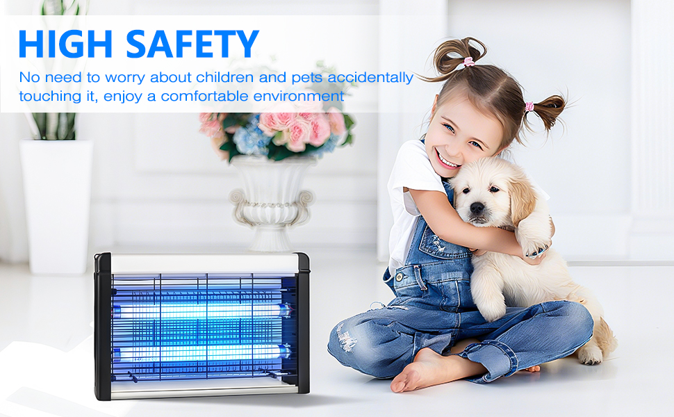 Child-Safe Mesh Guard and Whisper-Quiet Operation for Silent, safe electric fly trap usage,multiple safety nets are specially installed to prevent children and pets from accidentally touching the grid, doubling the safety.
