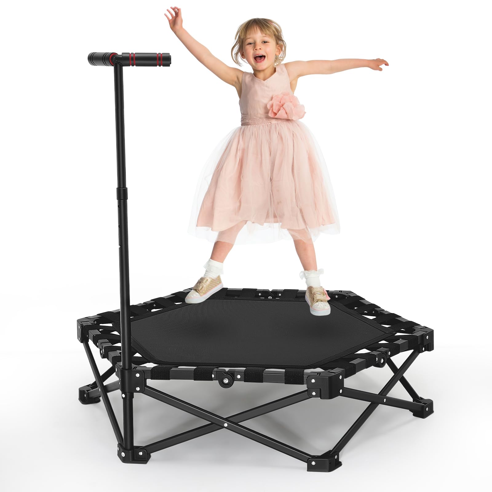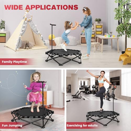 【Adjustable T-Handle】Our trampoline comes with an anti-slip T-handle featuring three adjustable heights (113 cm, 108 cm, 103 cm), making it suitable for kids, adults, and all kinds of occasions. Whether it’s for children’s playful jumps or adults’ fitness sessions, it delivers a comfortable, secure grip for every user.