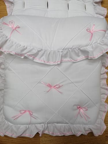 This charming universal fit pram set brings comfort and style to your baby’s pushchair, stroller, or buggy. The elegant white design features delicate pink bow accents and a pretty ruffled trim that adds a touch of sophistication to any pram. The cosytoes footmuff provides essential warmth and protection for your little one during outings, whilst the quilted diamond pattern offers both visual appeal and practical padding. The set includes a coordinating liner that fits securely into most standard prams, creating a cosy nest for your baby. The thoughtful design features strategic padding zones to support your baby’s comfort during walks and journeys. The pink and white colour scheme creates a classic, timeless look that complements various pram styles. This versatile pram set is designed to fit universally, making it a practical choice for parents with different pushchair models. The soft fabric construction ensures your baby stays comfortable, whilst the decorative bows add a delightful finishing touch. Perfect for keeping your baby snug during cooler weather whilst maintaining a stylish appearance.