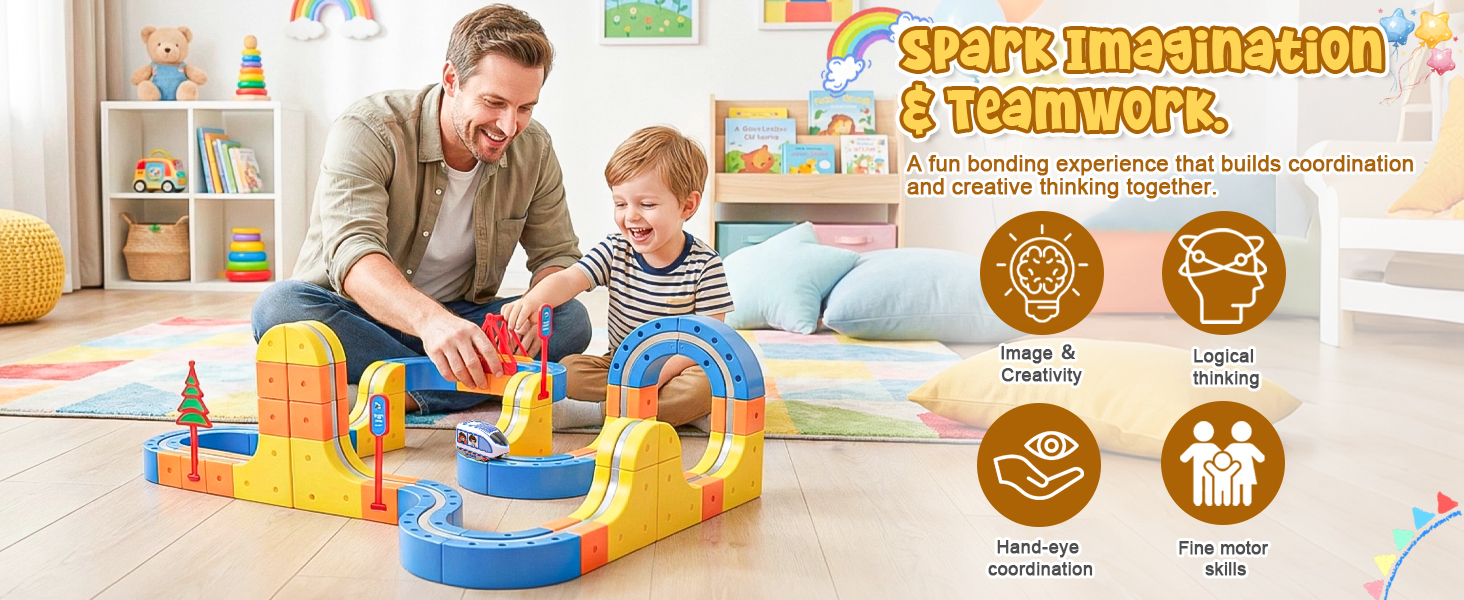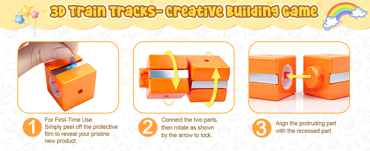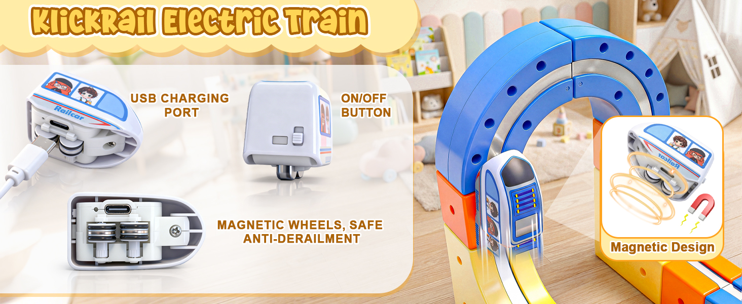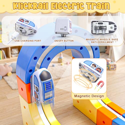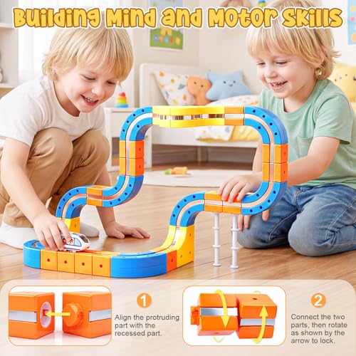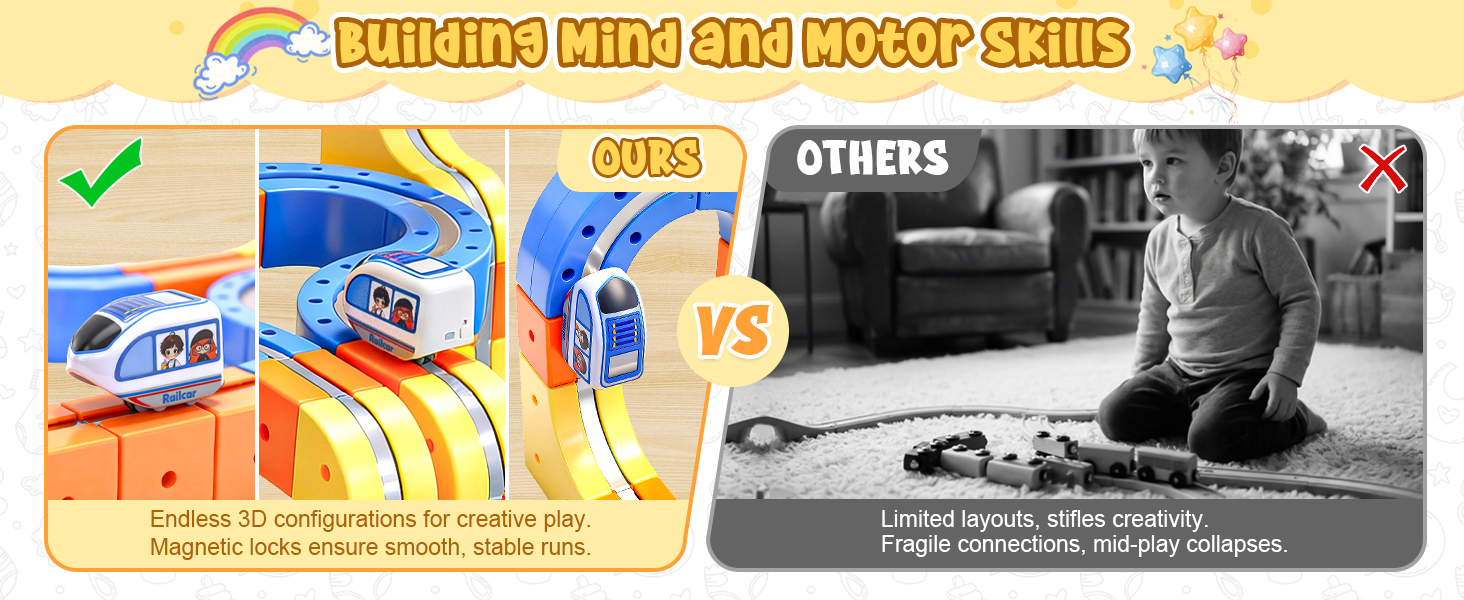 【Safe and Easy to Assemble – Magic Rail Train Set】Cube track made from durable, BPA-free plastic with smooth, rounded edges—track pieces withstand collisions, jumps, and repeated assembly. The secure snap-fit design ensures safe play for little hands.