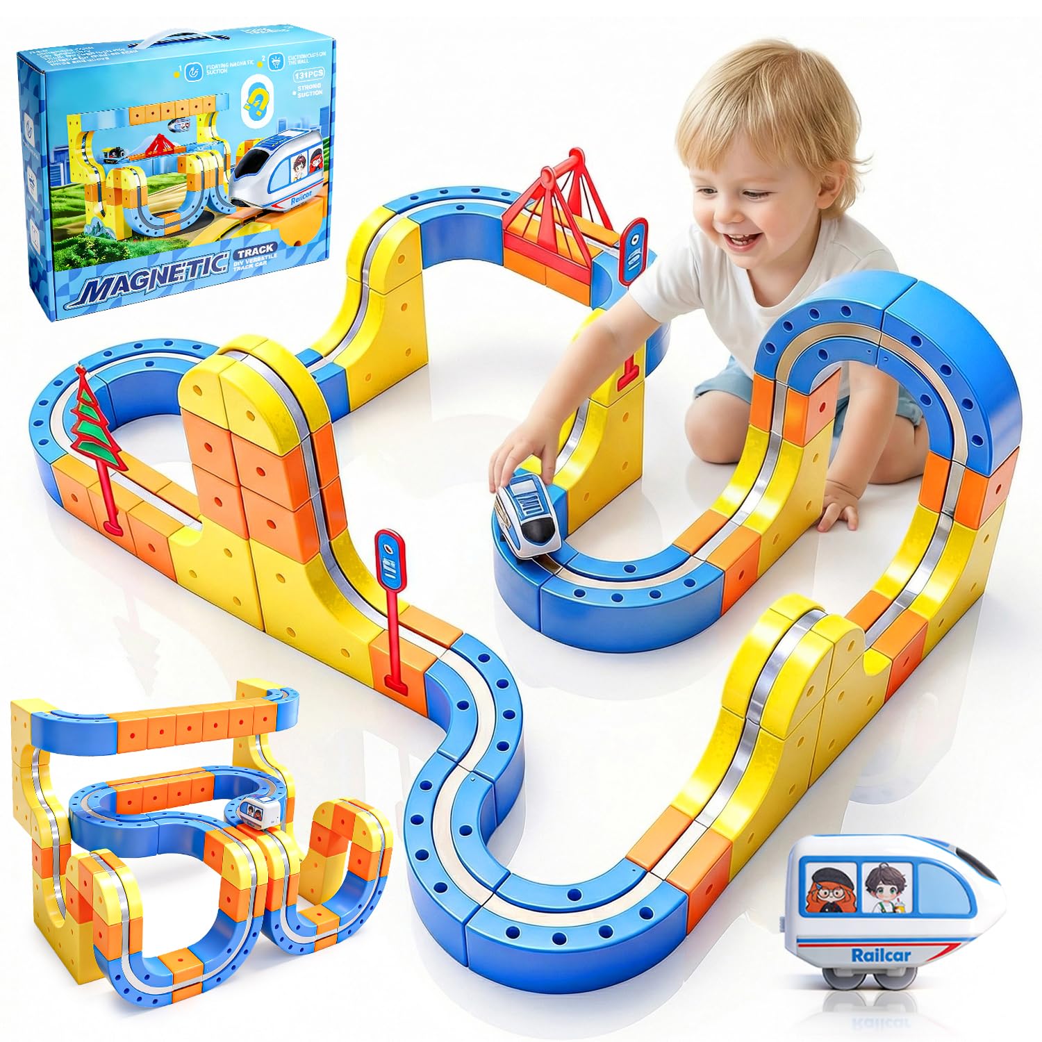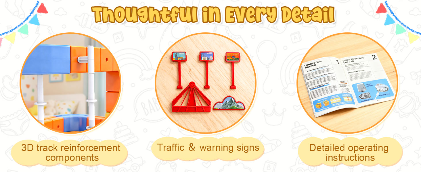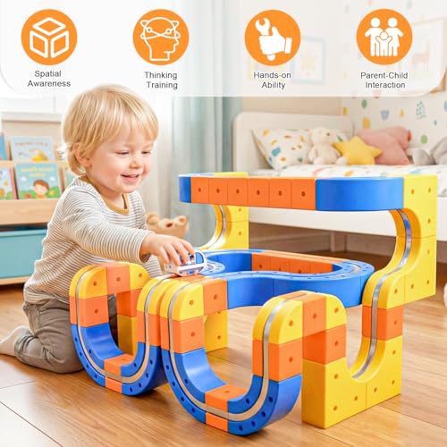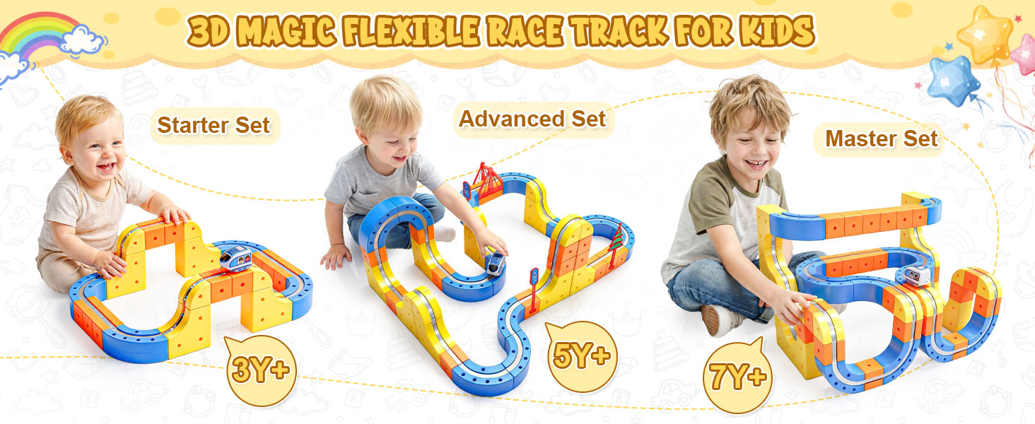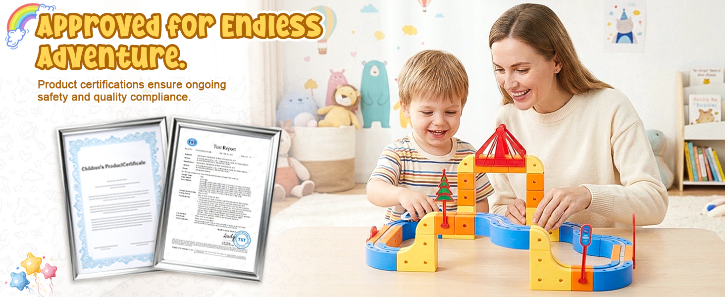 【Safe and Easy to Assemble – Magic Rail Train Set】Cube track made from durable, BPA-free plastic with smooth, rounded edges—track pieces withstand collisions, jumps, and repeated assembly. The secure snap-fit design ensures safe play for little hands.