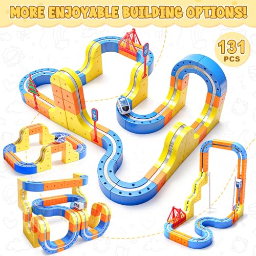 FOTSHARER Electric Train Set for 3 4 5 6 7 8, 3D Flexible Race Track 131 PCS Car Track for Toddlers 3-5, Track Fusion Toy Gravity Defying Train Track Embedded Layouts Train Track Set DIY Cube Track