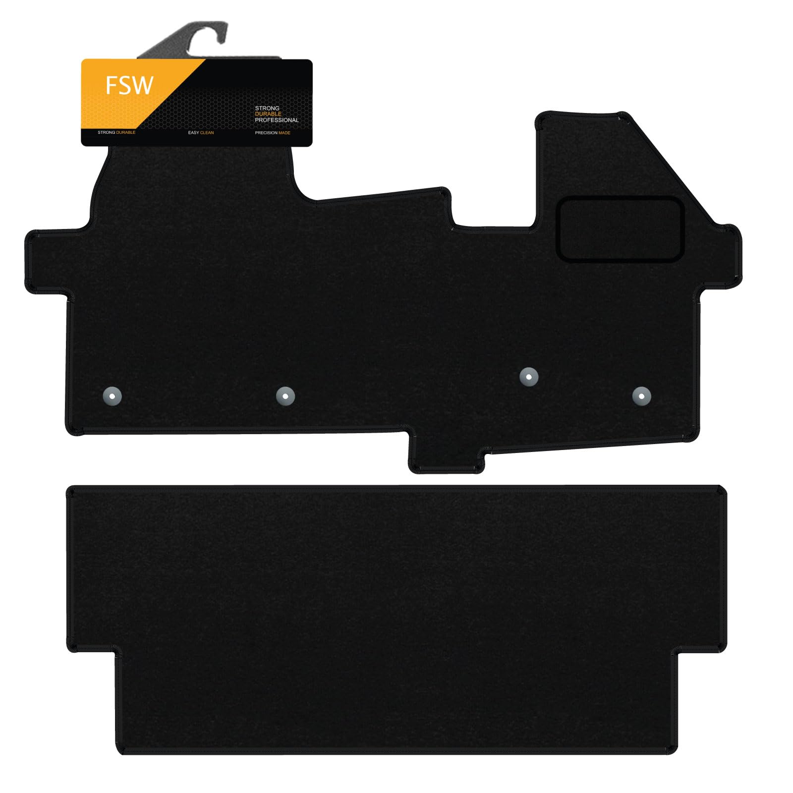 EDGED WITH BLACK CLOTH BINDING: Each black floor mat is expertly edged with cloth binding, providing a smart finish that enhances your footwells. FSW's black van carpet 2 set ensures a non-slip surface while delivering a stunning aesthetic and a clean display for your Ford Transit Custom Crew Cab Automatic 2024-On