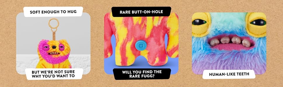 RARE BUTT-ON HOLE: Hunt for the collector’s mark on select Fugglers. Can you find the Fuggler with the rare butt-on-hole?