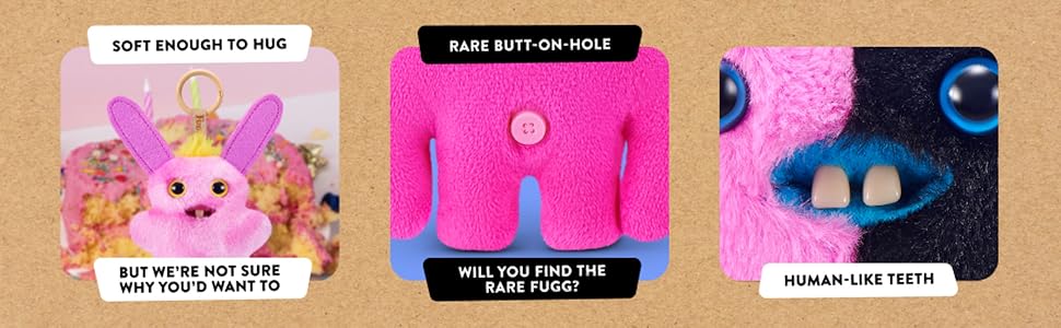RARE BUTT-ON HOLE: Hunt for the collector’s mark on select Fugglers. Can you find the Fuggler with the rare butt-on-hole?