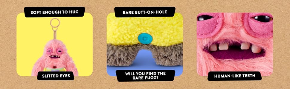 RARE BUTT-ON HOLE: Hunt for the collector’s mark on select Fugglers. Can you find the Fuggler with the rare butt-on-hole?
