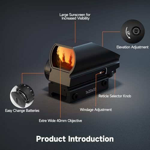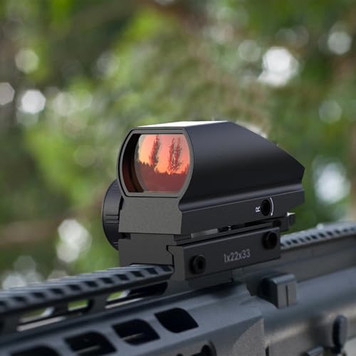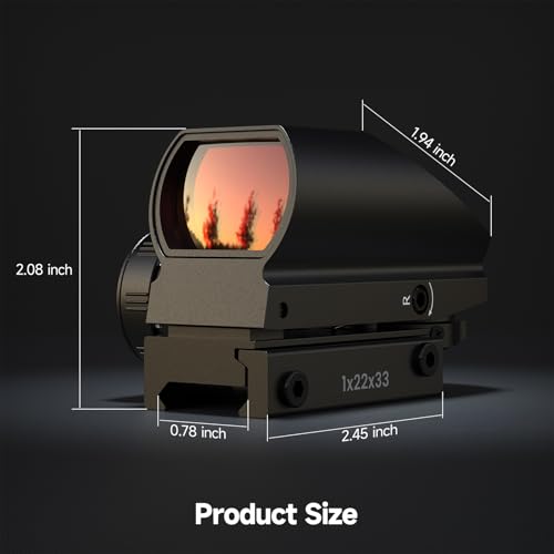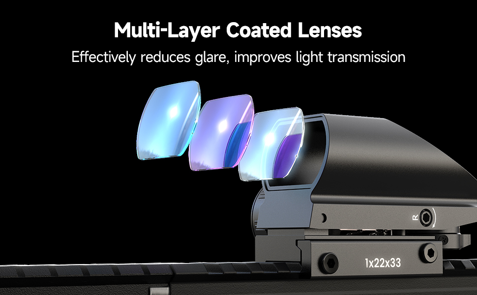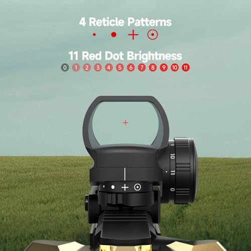 【4 Reticles & Clear Vision】 High-quality red dot sight equipped with 4 switchable reticles and an ultra-wide field of view for quick target acquisition. Multi-layer coated lenses effectively reduce glare and improve light transmission, providing a clear and sharp aiming point in both bright sunlight and low-light conditions.